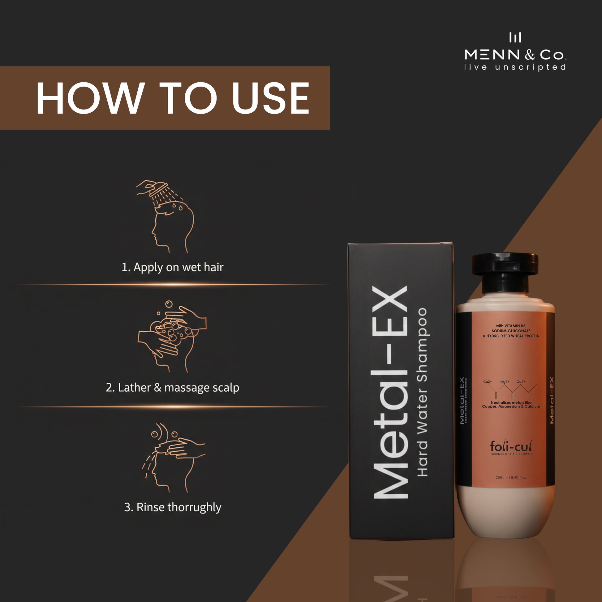 Foli-cul Metal-EX Hard Water Shampoo is engineered to neutralize and remove hard-water mineral deposits while strengthening hair from root to tip. Powered by Sodium Gluconate, Vitamin B5, and Hydrolyzed Wheat Protein, it detoxifies the scalp, restores softness, and improves overall hair health—without stripping natural moisture.