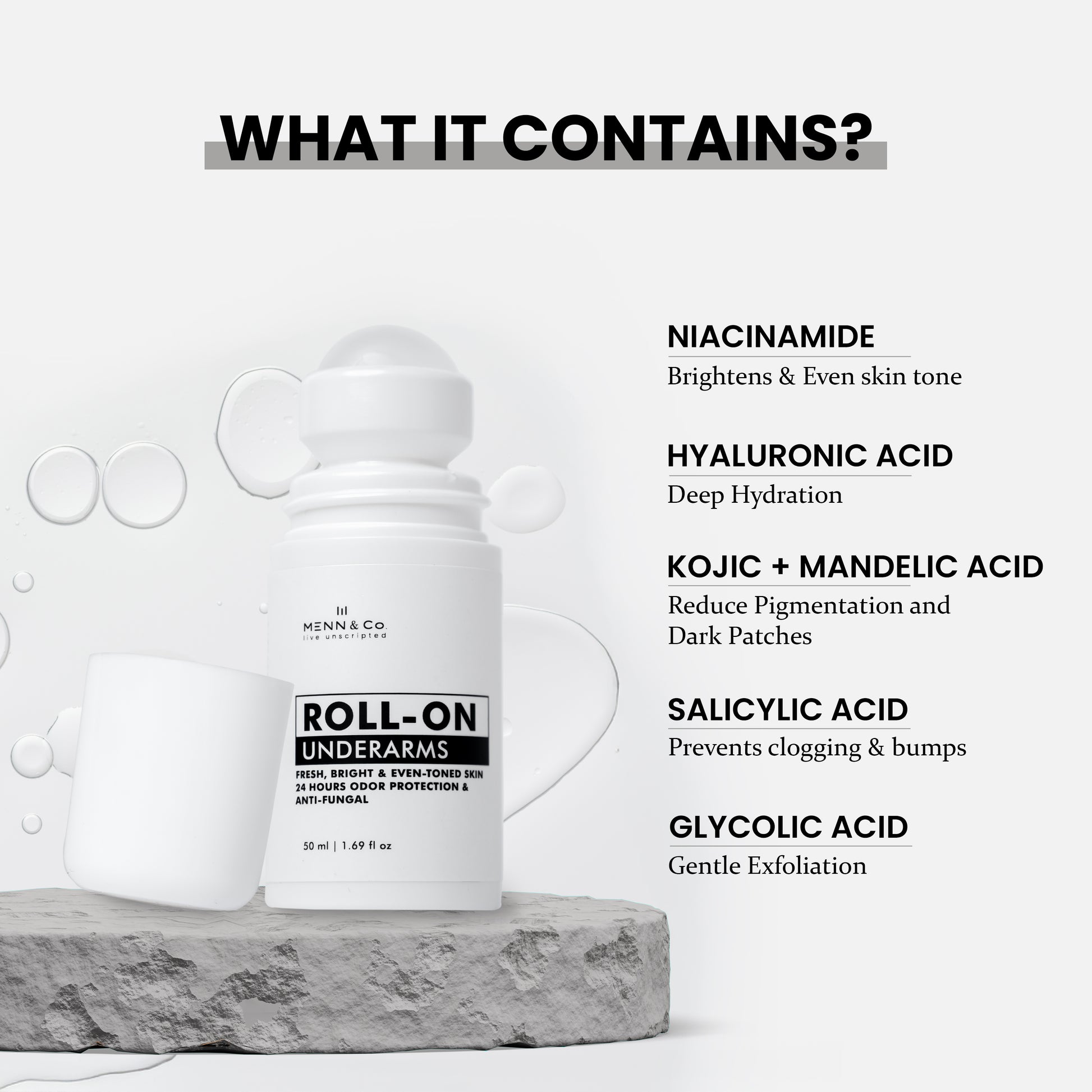 Experience all-day freshness and confidence with the MENN & CO Underarms Roll-On, specially formulated for men. This unique deodorizing formula helps fight sweat, odor, and underarm darkness while keeping your skin smooth and irritation-free. Enriched with natural ingredients and free from alcohol and parabens, it ensures lasting freshness with gentle care for your underarms.