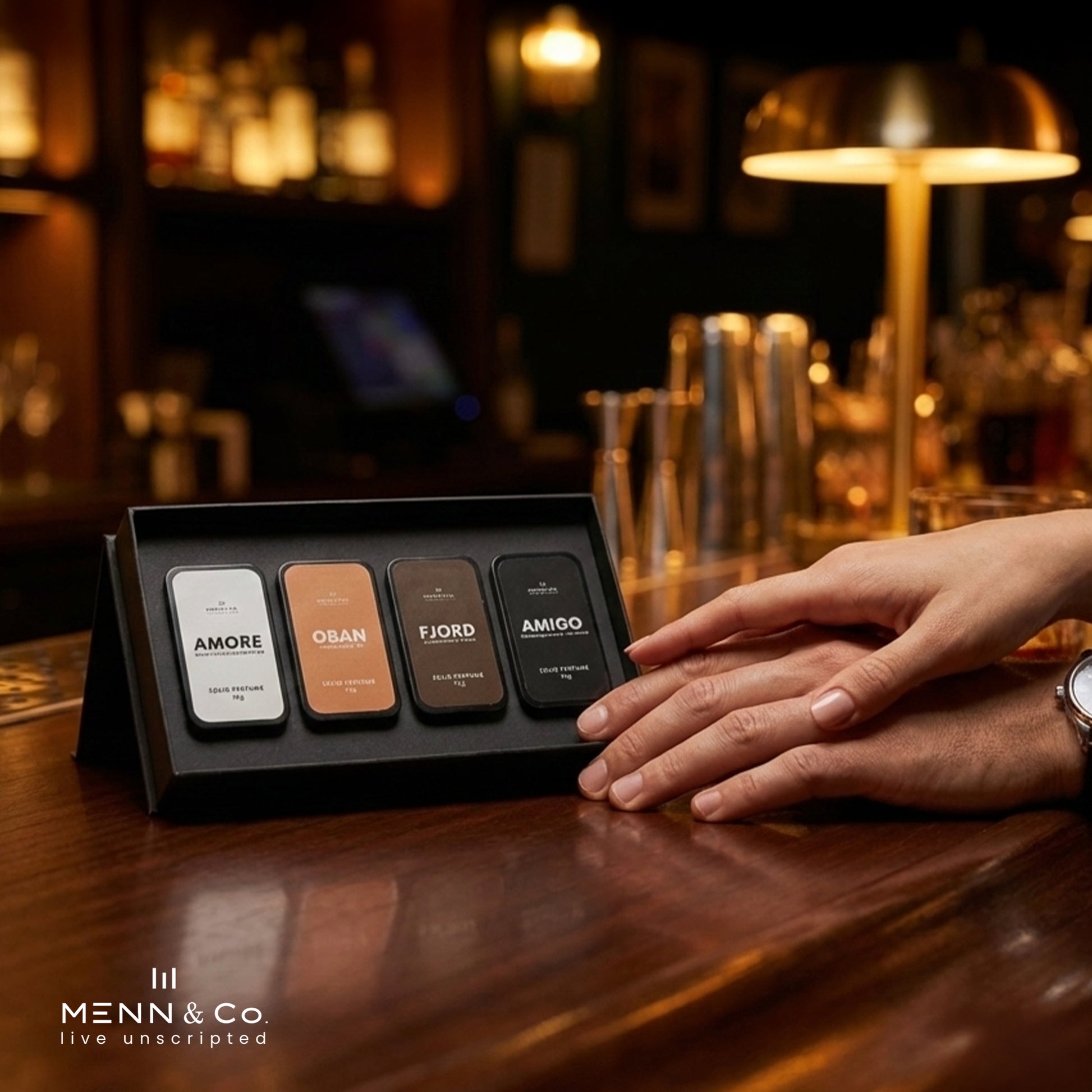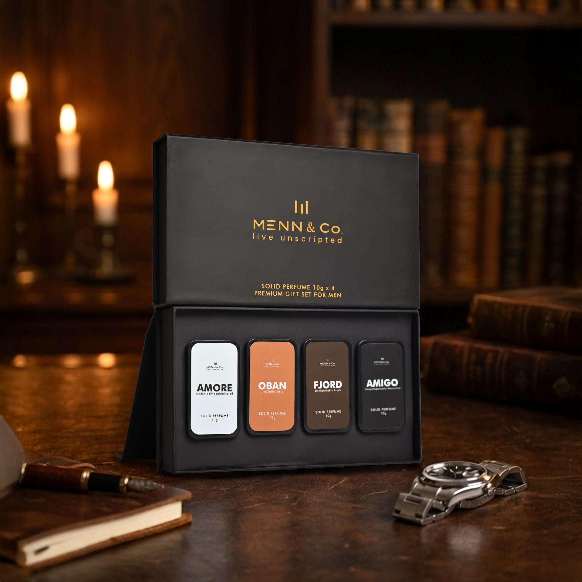 MENN & CO Premium Solid Perfume Gift Set is a curated collection of four signature solid fragrances — AMORE, OBAN, FJORD, and AMIGO — crafted for the modern gentleman. Designed for versatility and sophistication, this premium 10g x 4 set offers distinct scent profiles ranging from refined and fresh to bold and irresistibly masculine. Each solid perfume melts smoothly into the skin, delivering long-lasting fragrance without alcohol irritation. Compact, travel-friendly, and elegantly packaged, this luxury fragrance set is perfect for gifting or for men who appreciate variety in their daily scent signature.